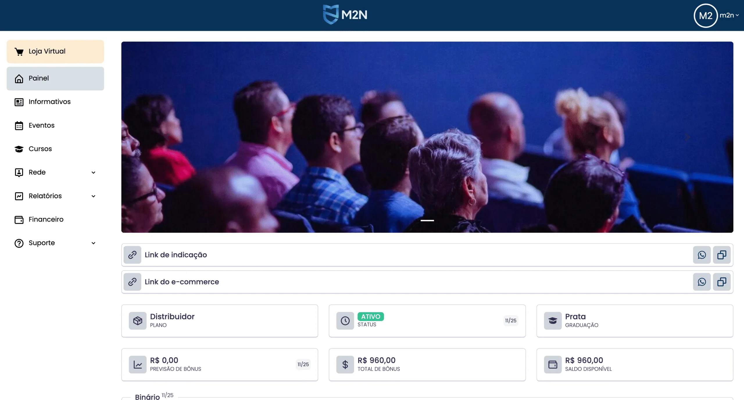 Com nossos 17 anos de mercado, aqui na M2N, nós nos orgulhamos de ser referência em sistemas de marketing multinível. Nossa jornada tem sido uma aventura incrível de inovação e dedicação para oferecer as melhores soluções tecnológicas, ajudando a otimizar e gerenciar as redes de nossos parceiros.